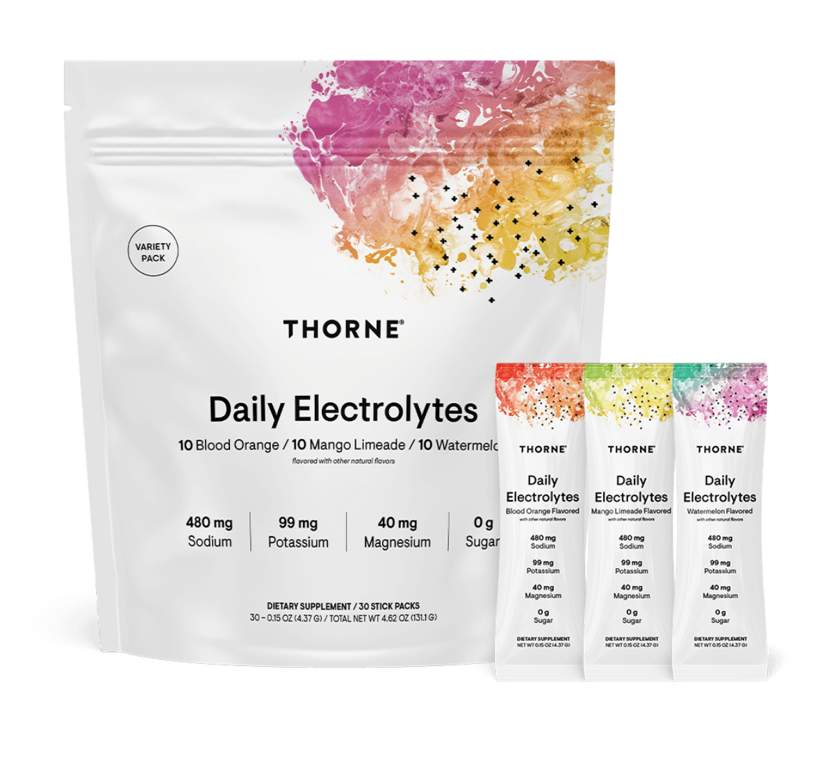 Daily Electrolytes is provided in easy-to-use single-serve stick packs, perfect for your teenager’s backpack or sports bag. Thorne’s Youth Stack includes the Daily Electrolytes Variety Pack with all three delicious flavors: Watermelon, Mango Limeade, and Blood Orange.